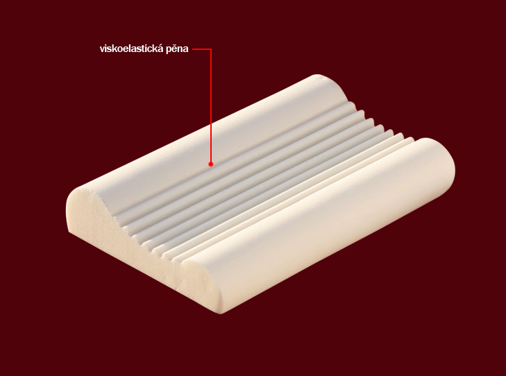 Anatomický polštář z viscoelastické pěny, která se vyznačuje výbornou tvarovou pamětí. Tato pěna mění tuhost v závislosti na absorbovaném teple, čímž tak dosáhneme dokonalé opory krční páteře a uvolnění krčního svalstva.